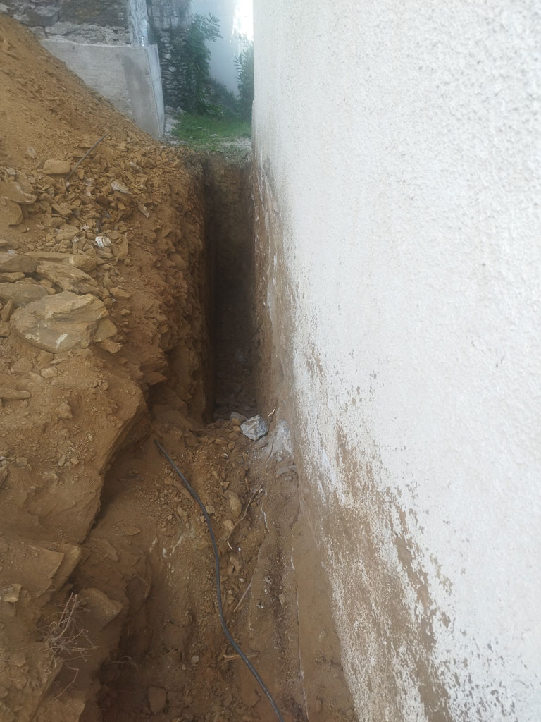 Πραγματοποιήθηκε ενίσχυση της υπάρχουσας πέτρινης τοιχοποιίας σε κρίσιμα σημεία. Παράλληλα, οι εξωτερικοί τοίχοι αναστηλώθηκαν με επαναληπτική αρμολόγηση (repointing), ενώ εσωτερικά εφαρμόστηκε νέος σοβάς, δημιουργώντας λεία και έτοιμα επιφάνεια.