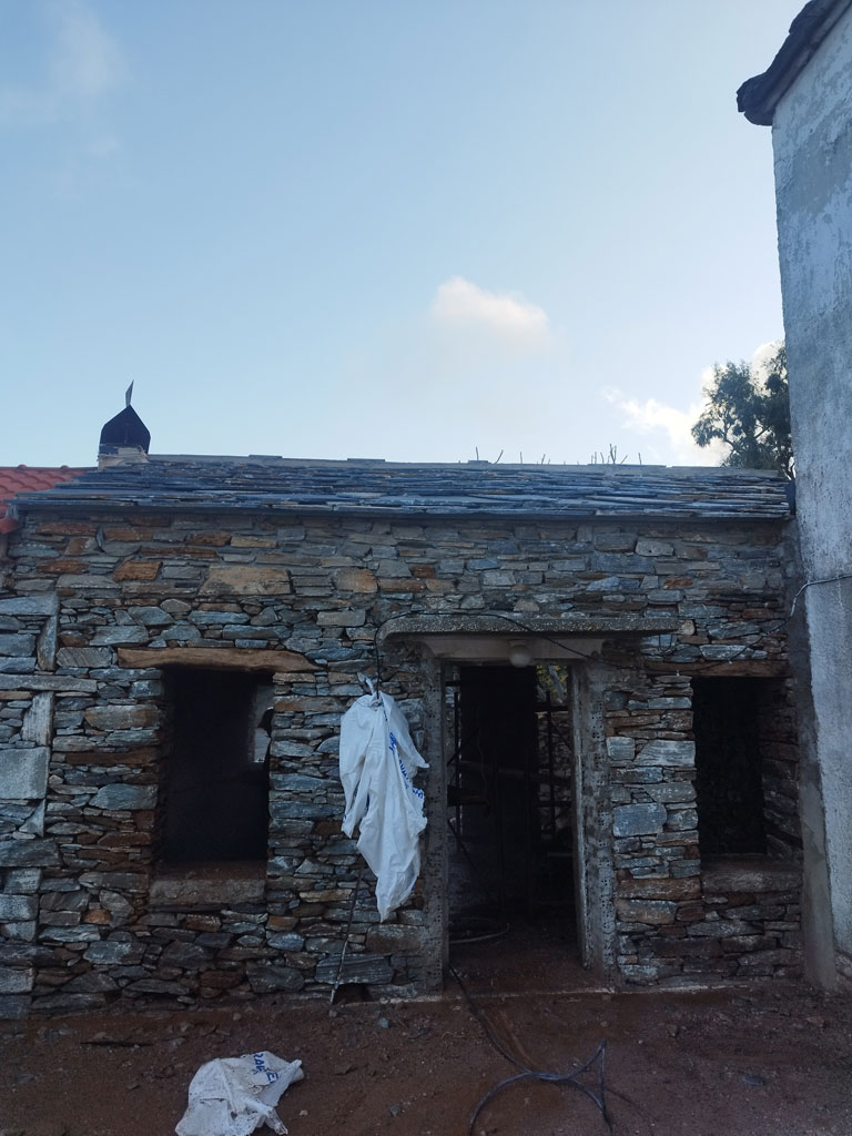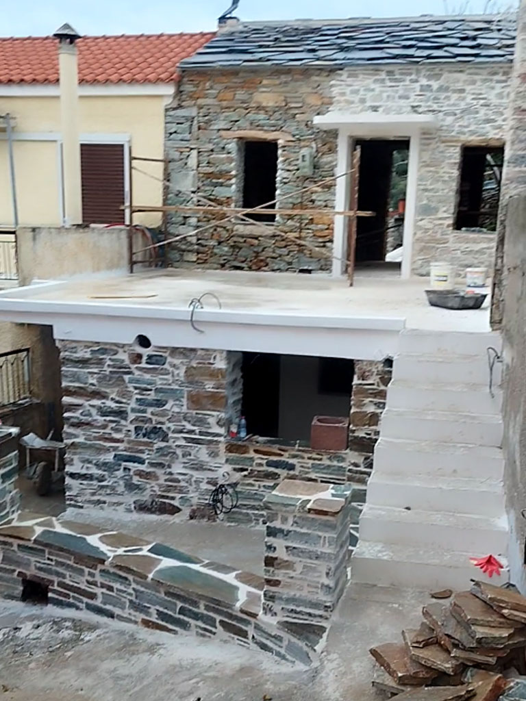 Πέτρινη σκεπή, επένδυση πλακιδίων, διαμόρφωση αυλής & αρμολόγιση σε μεζονέτα.