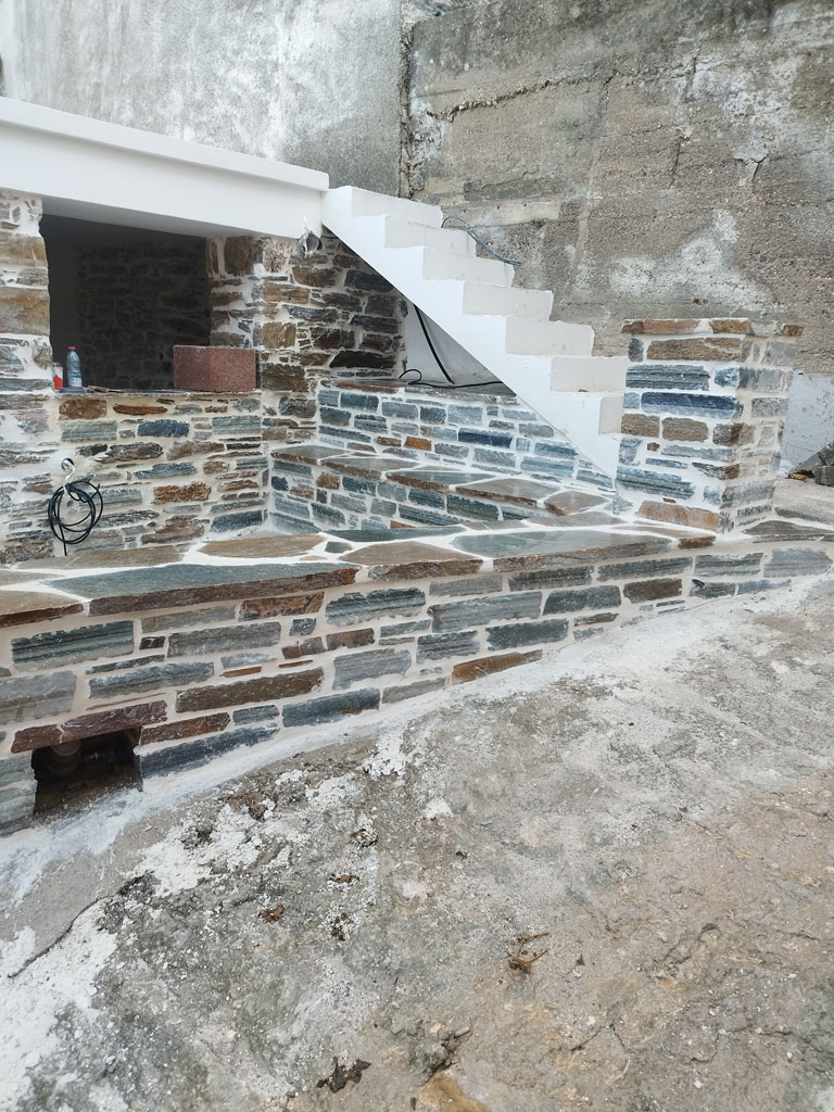 Η αυλή αναμορφώθηκε με την τοποθέτηση φυσικής πέτρας για εξωτερική χρήση. Το υλικό επιλέχθηκε για αντοχή και αισθητική, δημιουργώντας μονοπάτια ή επιφάνειες που ενσωματώνονται άψογα με το πέτρινο σπίτι.