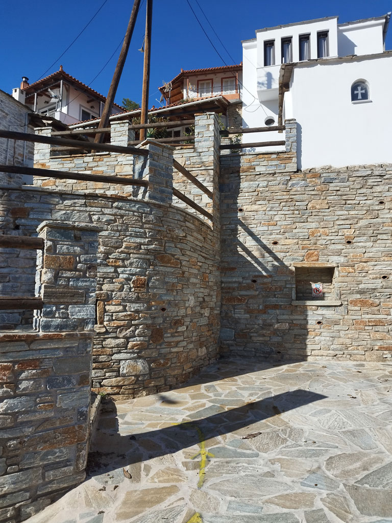 Υλικά & Παραδοσιακή Τεχνική: Χρησιμοποιήθηκαν επιλεγμένες φυσικές πέτρες (τοπική πέτρα), κομμένες και διαμορφωμένες για να δημιουργήσουν ένα ζωντανό, οργανικό τοίχωμα. Κάθε πέτρα τοποθετήθηκε με προσοχή, σεβασμό στις προδιαγραφές της αρμολόγησης.
